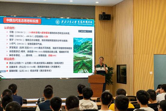 长安校区处于秦岭脚下,是生态学发展得天独厚的优势。教授向新生们介绍了本校位于秦岭的样地及研究基地,新生们皆满怀期待。最终,郝教授引用“寻求简单,但不可信之”一言作结,阐明了生态学的特点。