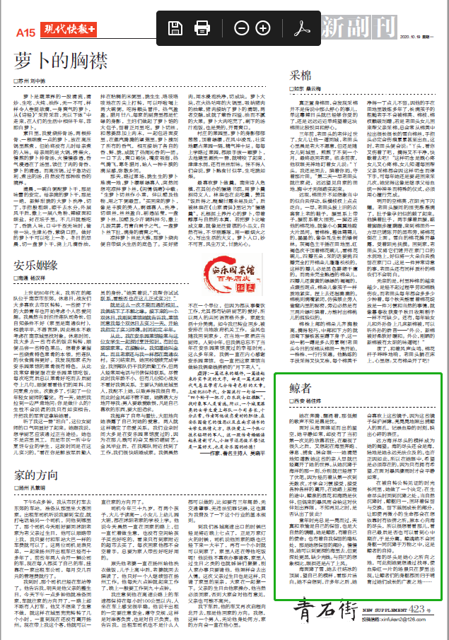 本科生杨佳炜的文章《鲸者》,通过第一视角的方式,以鲸的口吻表达了对人类无情杀戮,并破坏大自然生态平衡行为的控诉。文章在现代快报2020年10月19日这一期正式刊发。