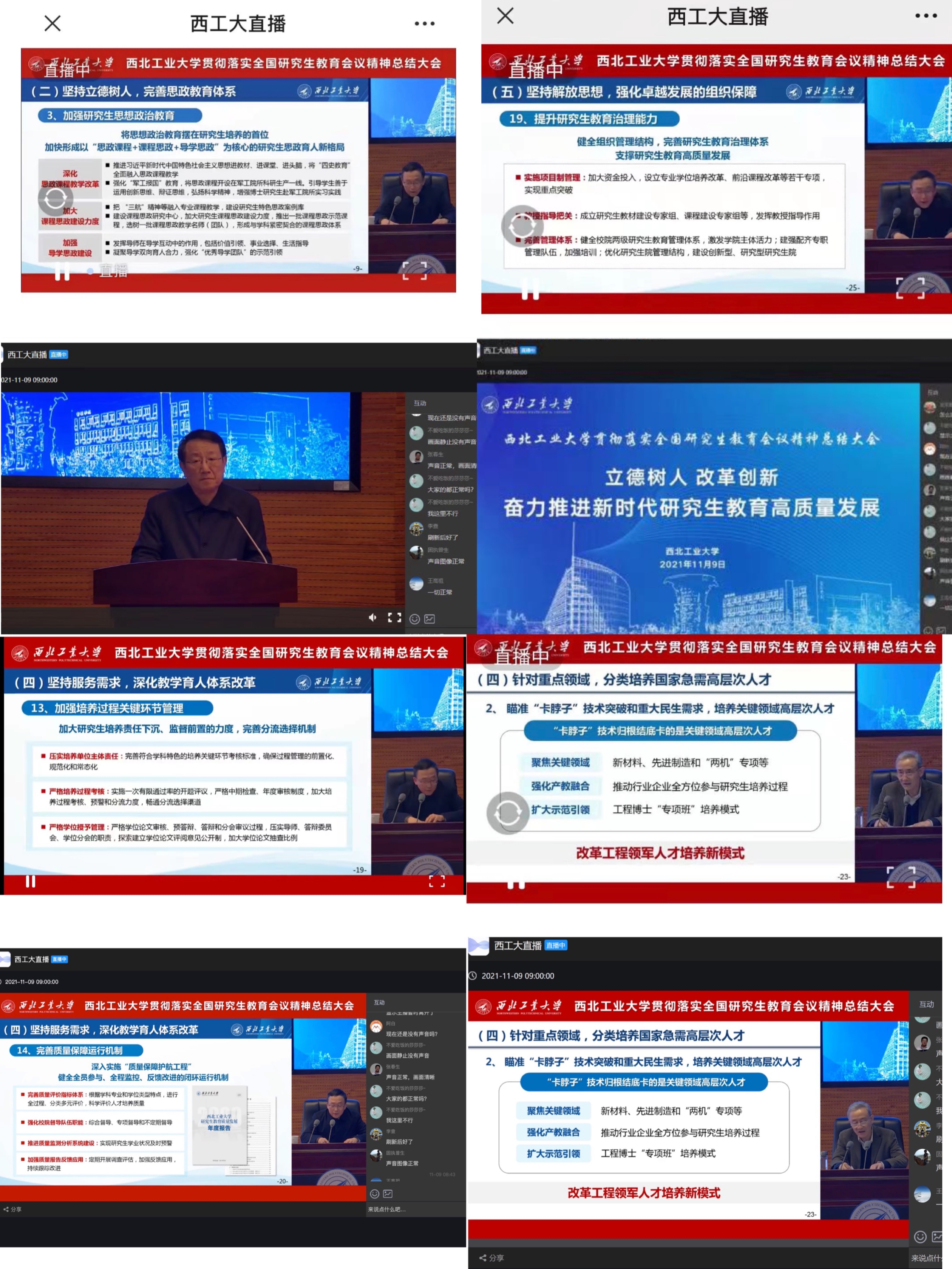 党政领导班子成员、研究生导师及研究生代表、办公室相关管理人员等分别在主会场、分会场和在线会场参加了学校“贯彻落实全国研究生教育会议精神总结大会”。