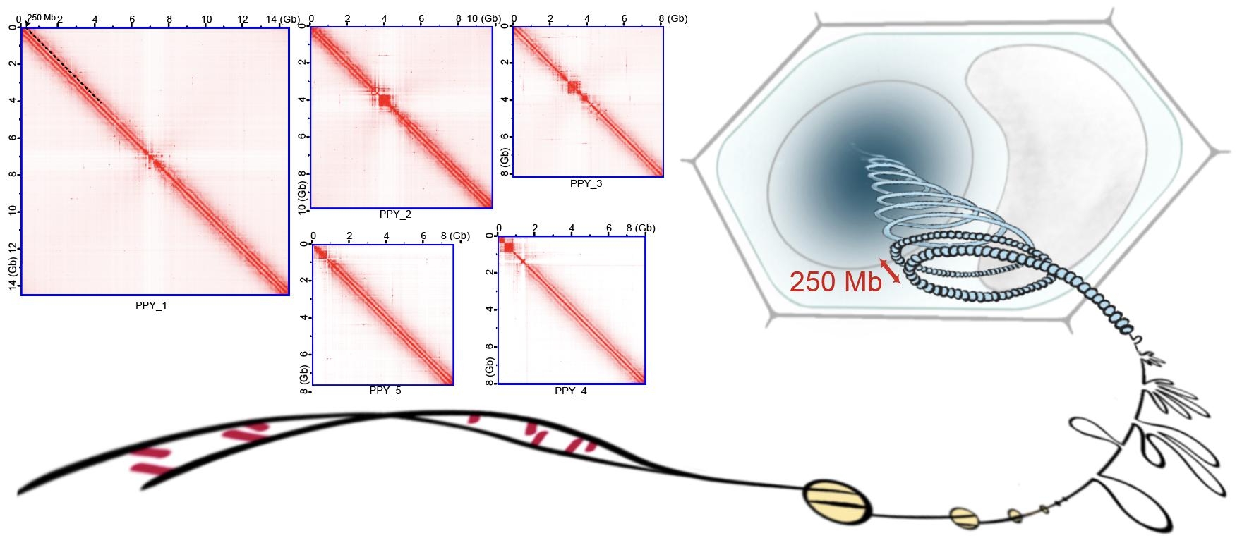 面对超大基因组组装的世界性难题,研究团队创新研发染色体组装策略(已获国家专利ZL202410969593.6),成功绘制出滇重楼五条巨型染色体图谱。通过Hi-C数据分析,研究团队首次发现这些"巨无霸"染色体在细胞两次分裂间的休息期细胞分裂间期仍保持独特的高阶螺旋结构,每圈螺旋长达250 Mb,颠覆了传统认知。