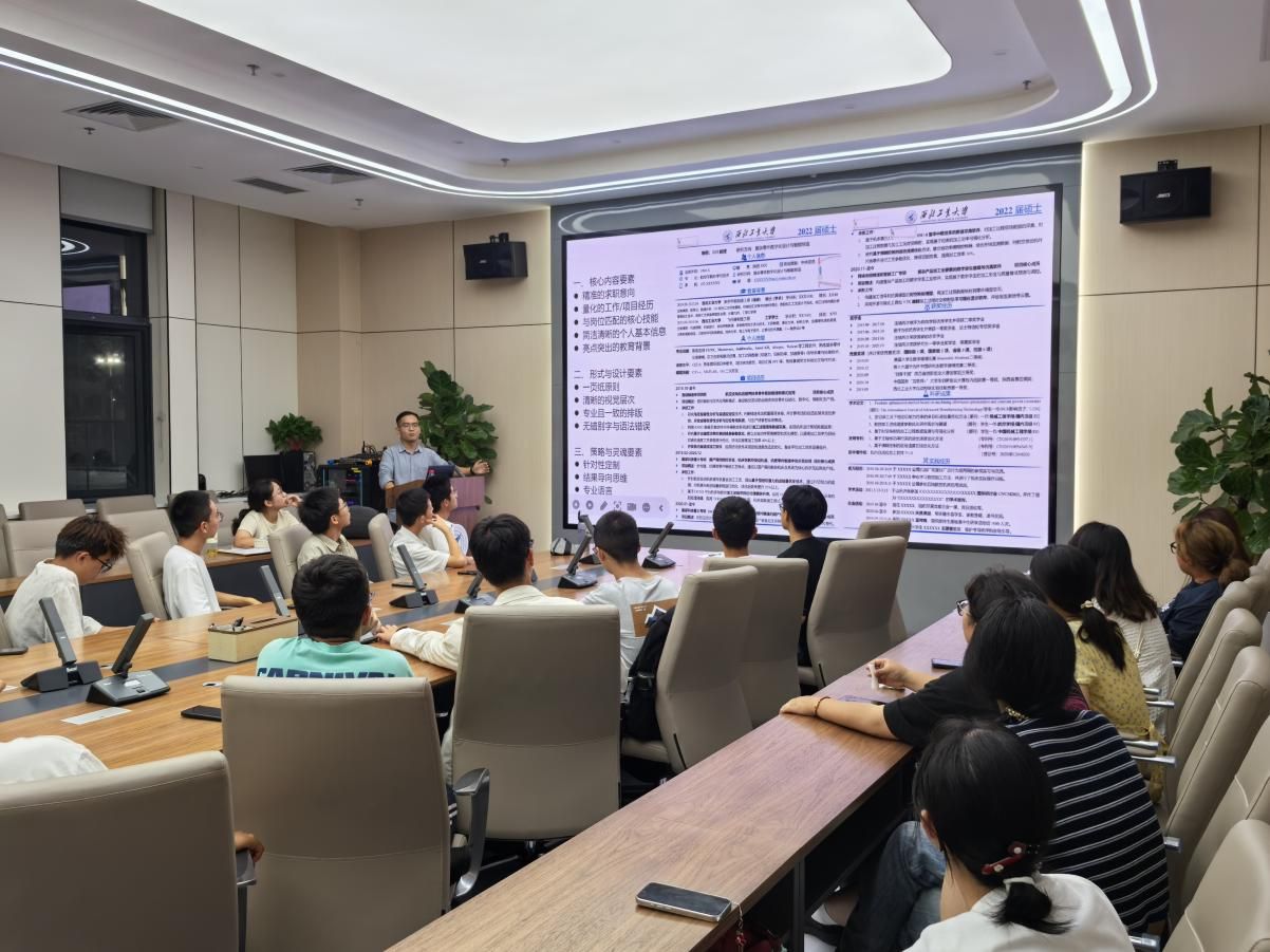 随后,冯硕聚焦简历制作,结合优秀案例从内容、设计、策略三方面讲解,强调明确求职意向、量化经历、规范排版,遵循“一页纸原则”,投递时注重针对性、避免错误。