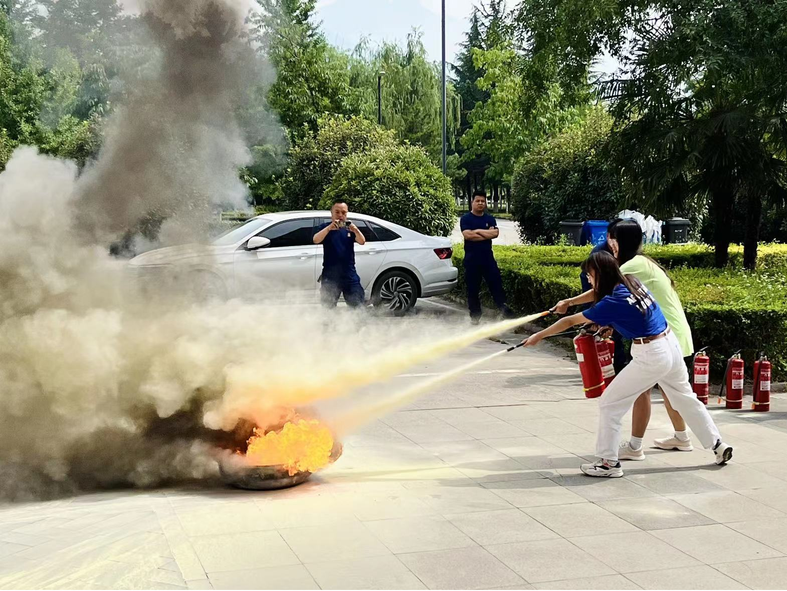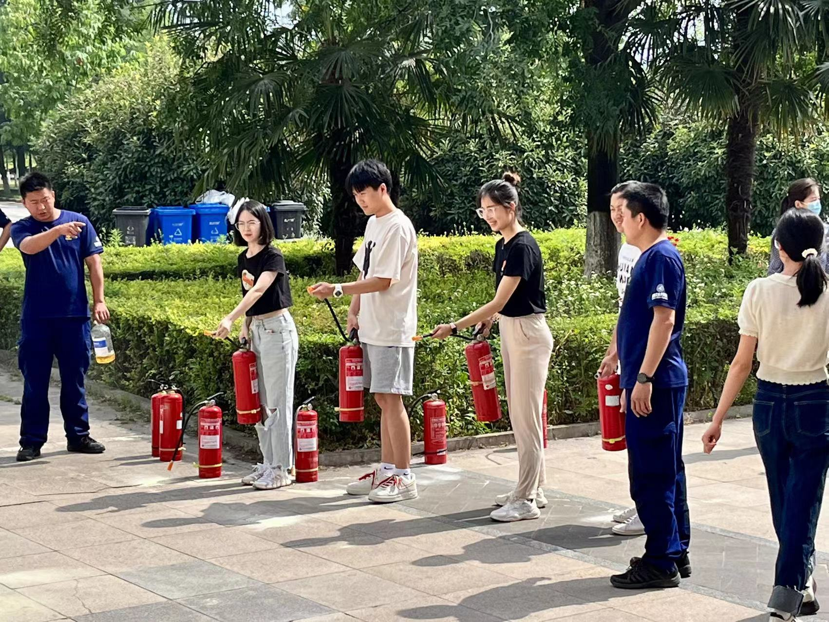 随后,在胡涛老师的指挥下,全院师生进行了逃生演练。师生们从学院各个安全通道有序撤离,空旷处胡涛老师对灭火器的种类和操作方法进行了演示,并模拟火灾现场对师生进行了灭火器实操训练。
