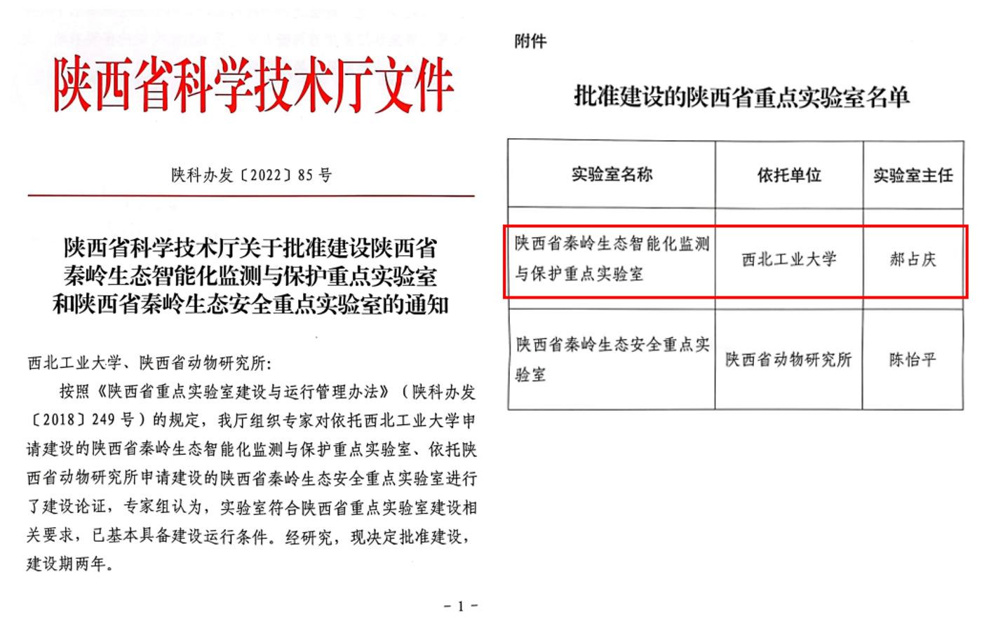 设立的“陕西省秦岭生态智能化监测与保护重点实验室”获得批准建设。