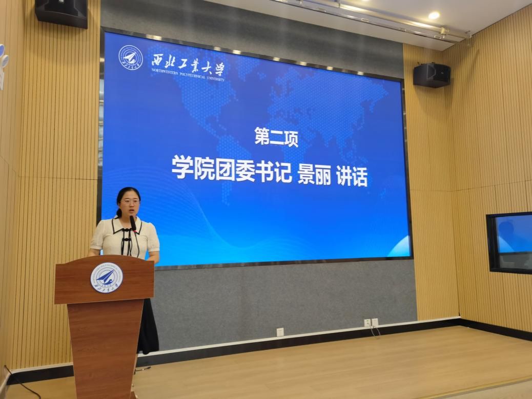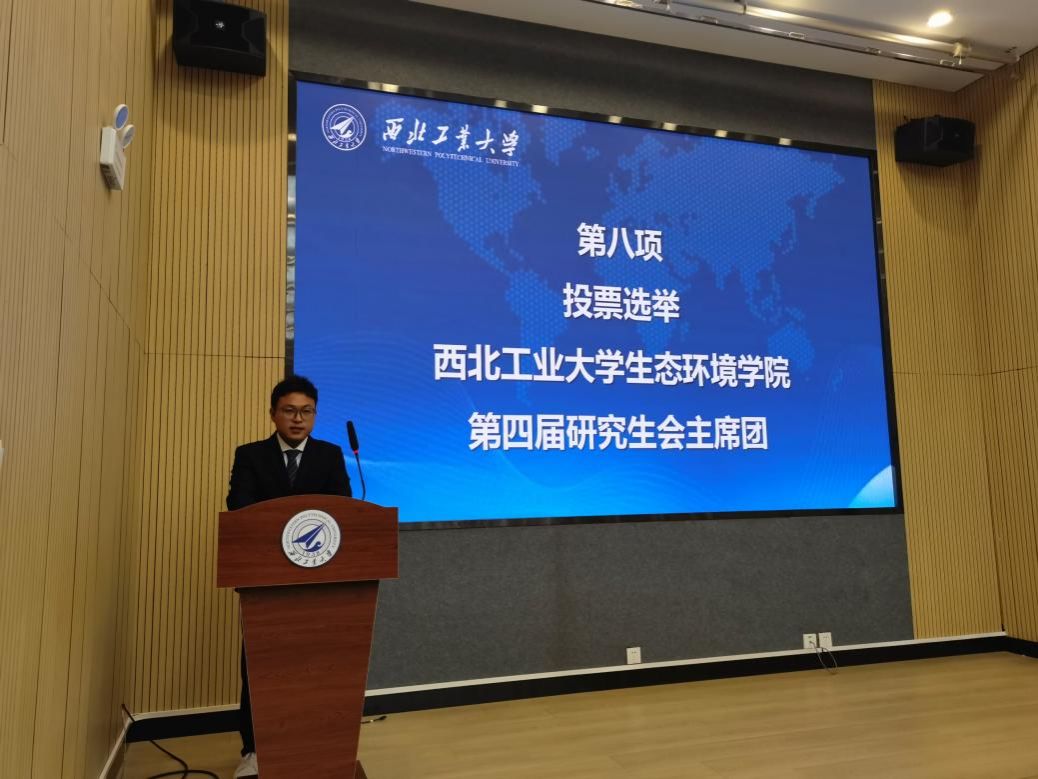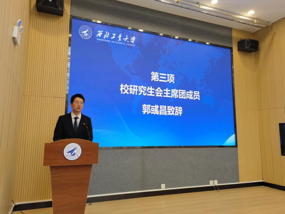 校研究生会主席团成员郭彧昌致辞,他祝愿学院研究生能不断焕发青春活力,激发创新潜能,丰富学生活动,取得更加优异的成绩。