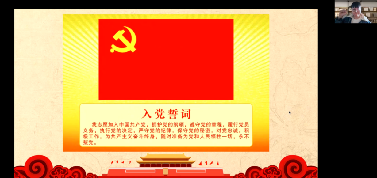 本次活动共分为三部分。首先是,支部书记王淋淋带领支部参会人员重温入党誓词,这一刻提醒每位毕业生党员牢记党员使命,永葆政治本色!并且希望支部全体党员同志能够不忘初心,薪火相传。