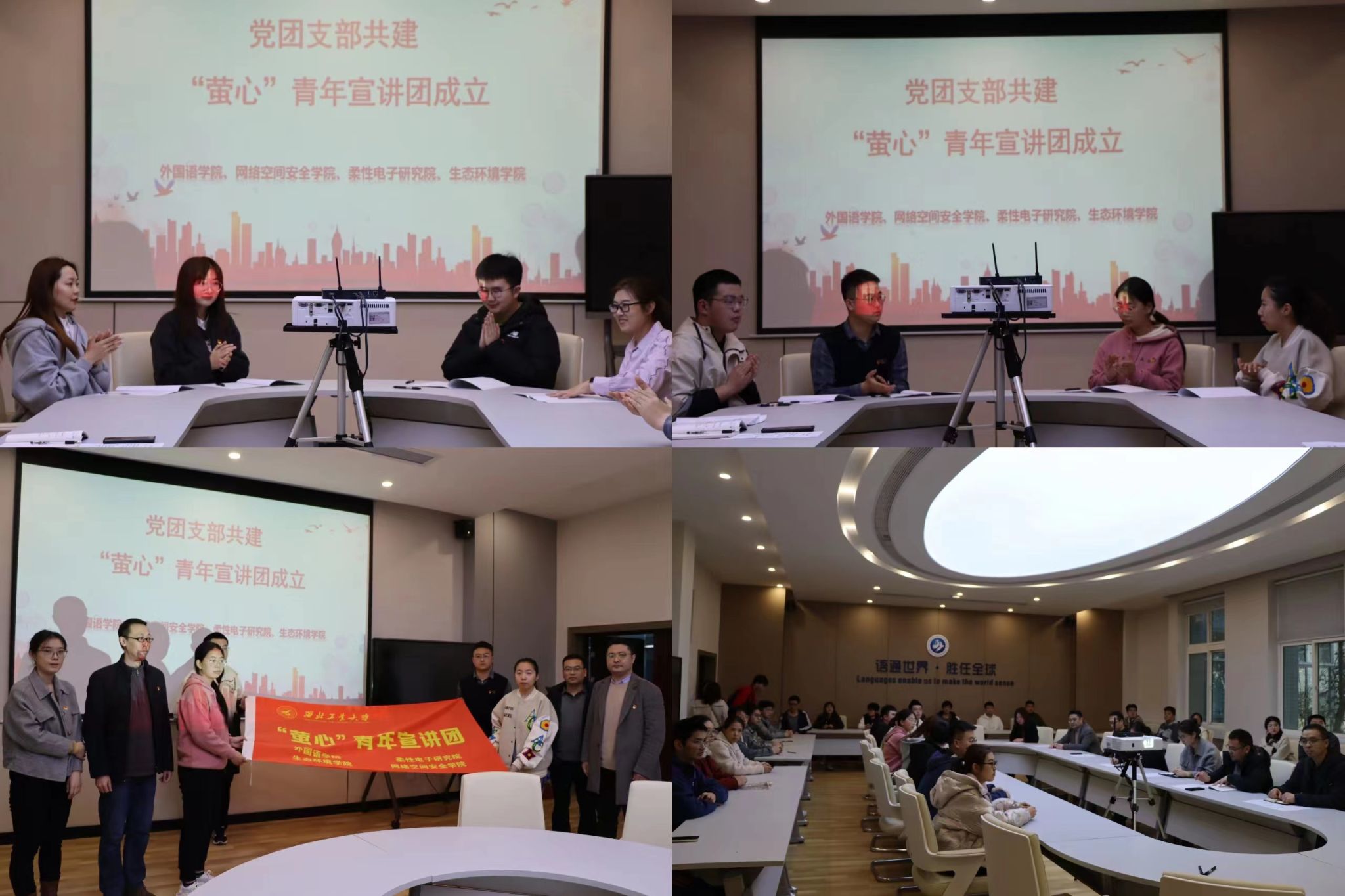 接着是四院学生宣讲团成立授旗仪式。为深入学习宣传贯彻党的二十大精神及习近平新时代中国特色社会主义思想,四院成立“萤心”青年宣讲团。外国语学院党委副书记马颖、网络空间安全学院党总支副书记禹亮, 日韩无码